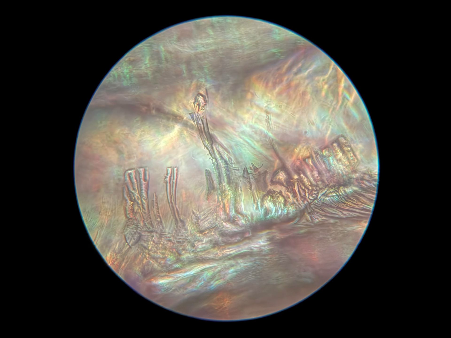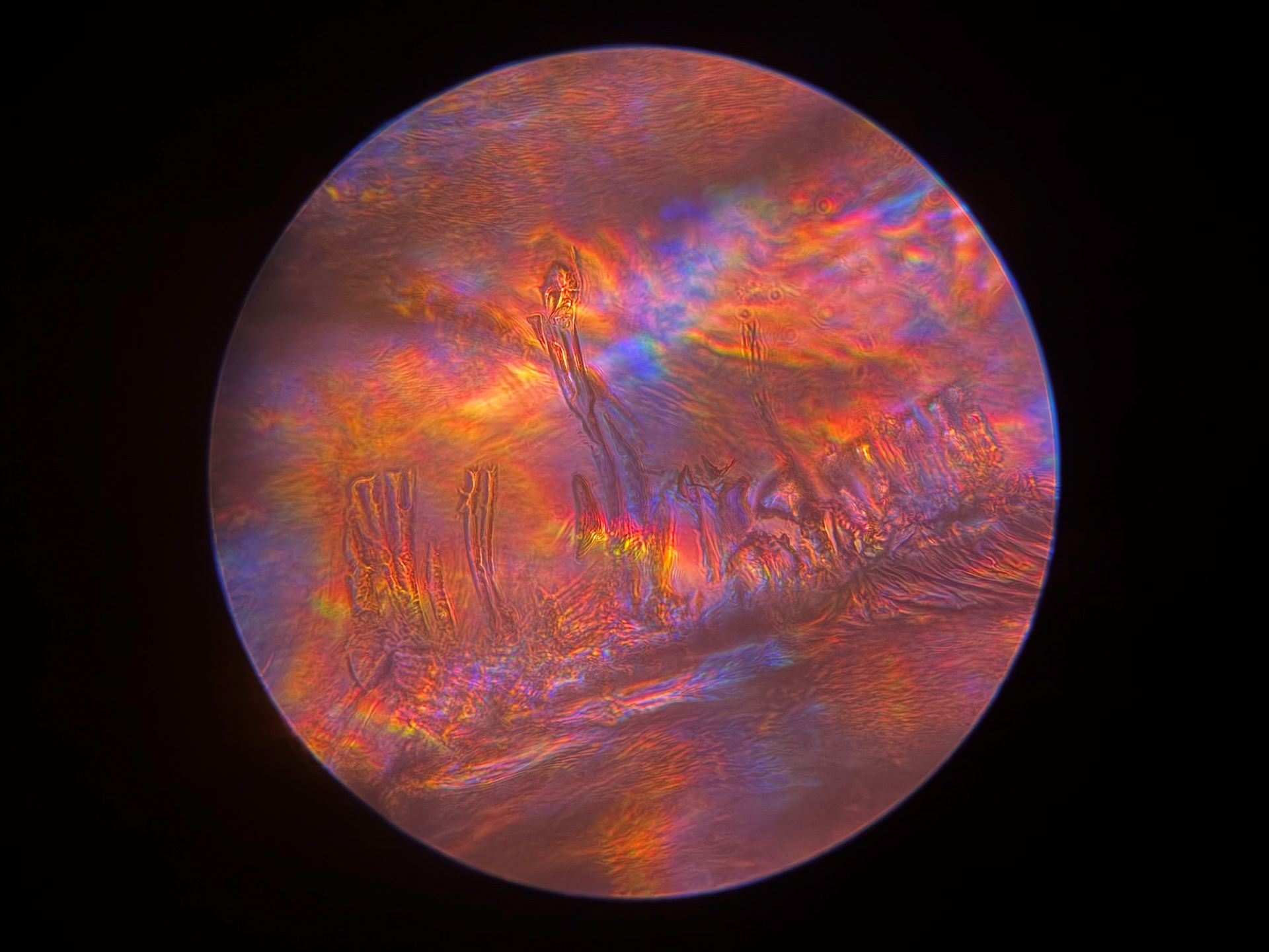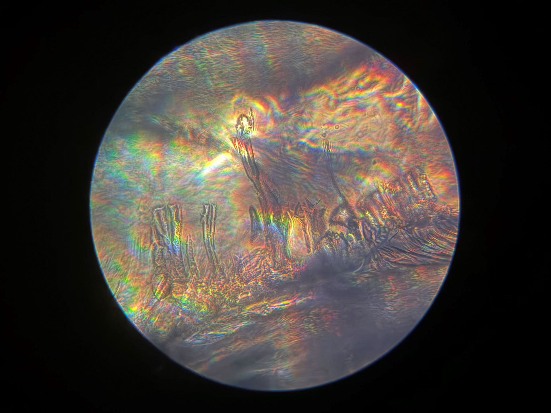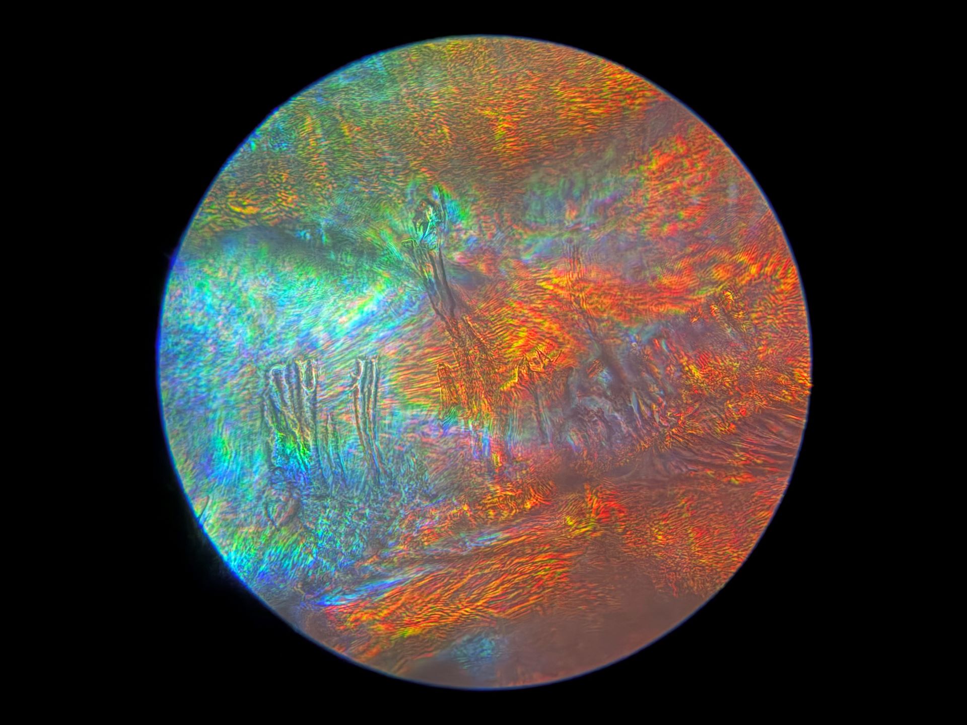 Because of the 40x magnification in this 1/8 inch by 1/8 inch area of broken glass, and how drastically the focus can change with so little adjustment, I may never find this spot on the broken slide again. Even if I can, the light also changes at such a small scale that none of these images will ever be recreated. Instead of mourning that, I'm going to spend more time on this tiny patch of glass to see what else I can find. I have my microscope out of storage now, so there's more coming very soon!