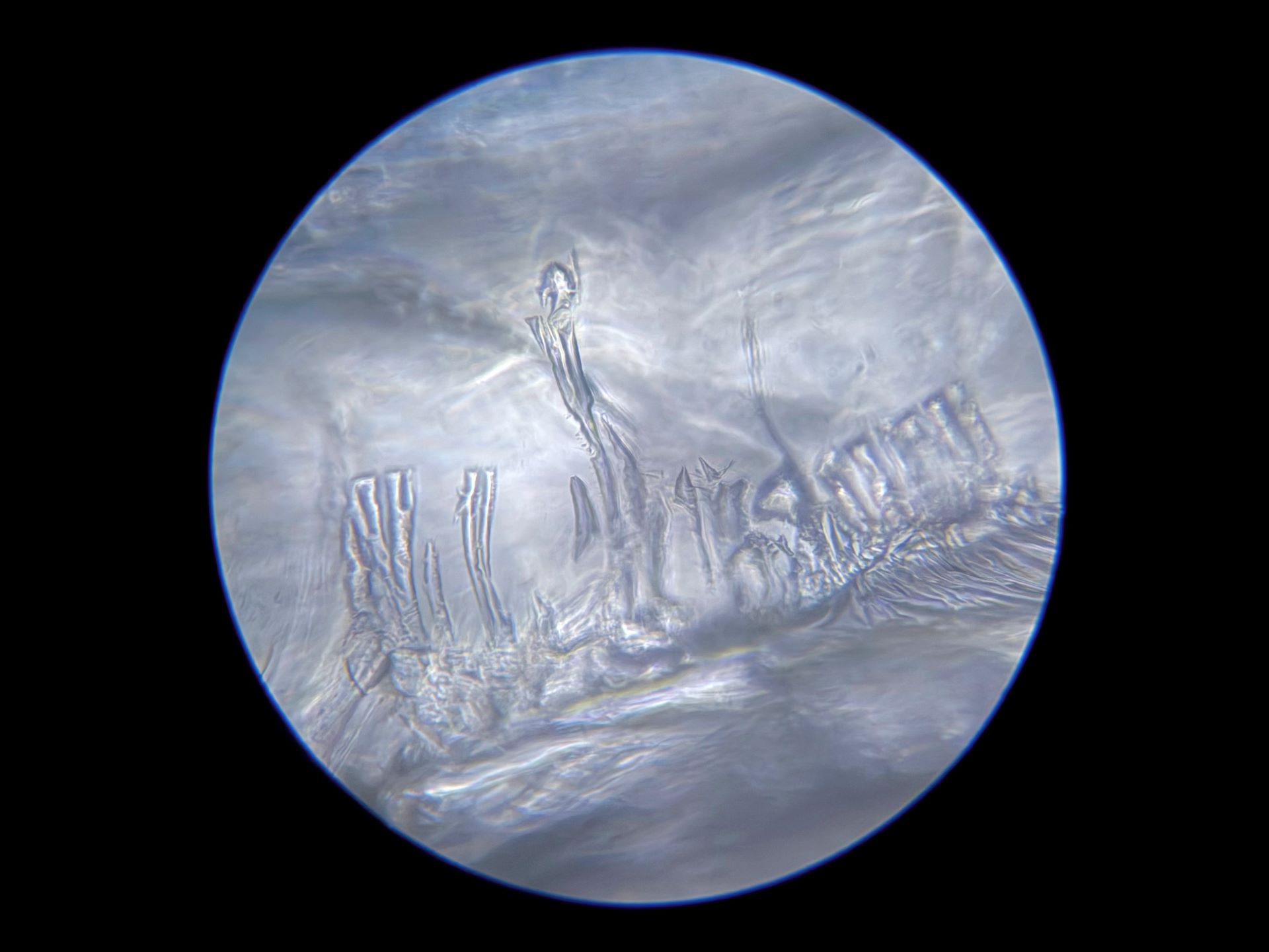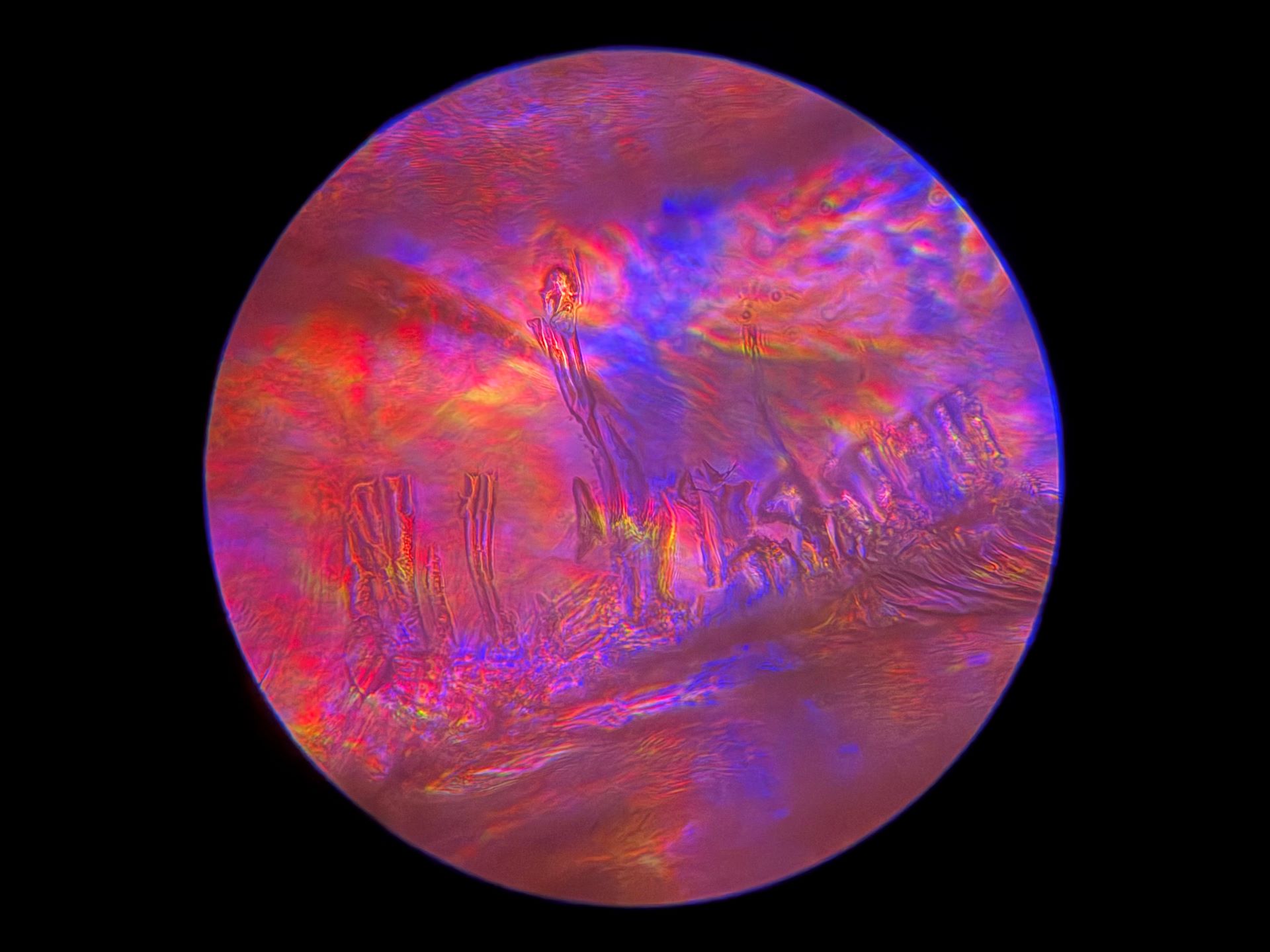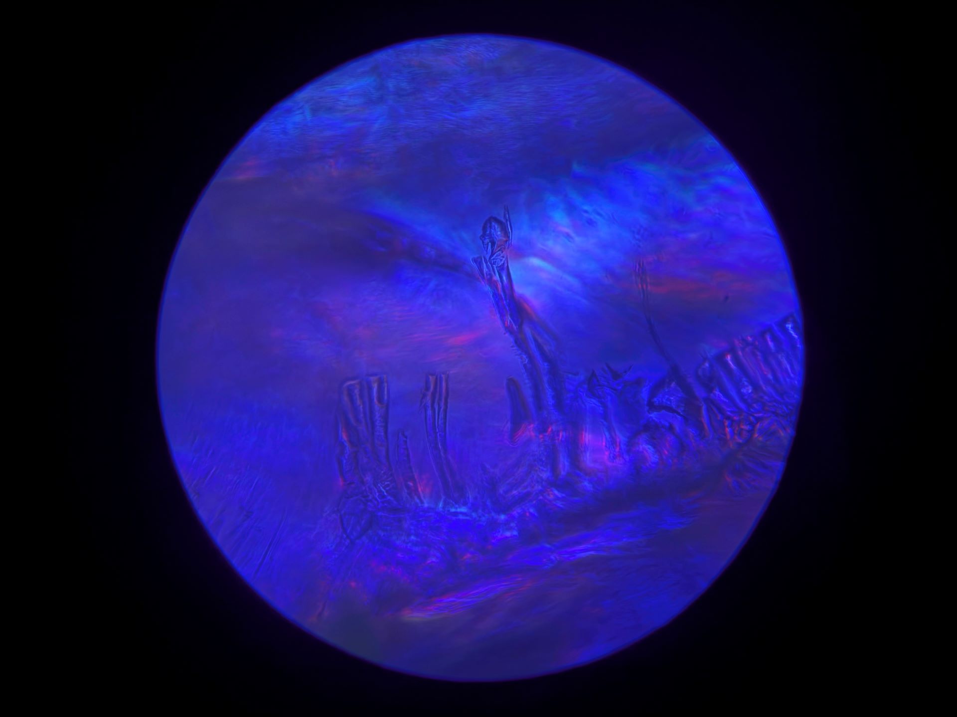 Because of the 40x magnification in this 1/8 inch by 1/8 inch area of broken glass, and how drastically the focus can change with so little adjustment, I may never find this spot on the broken slide again. Even if I can, the light also changes at such a small scale that none of these images will ever be recreated. Instead of mourning that, I'm going to spend more time on this tiny patch of glass to see what else I can find. I have my microscope out of storage now, so there's more coming very soon!