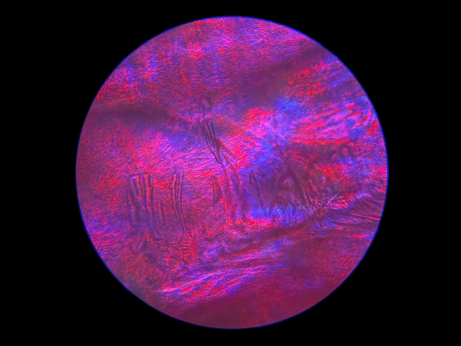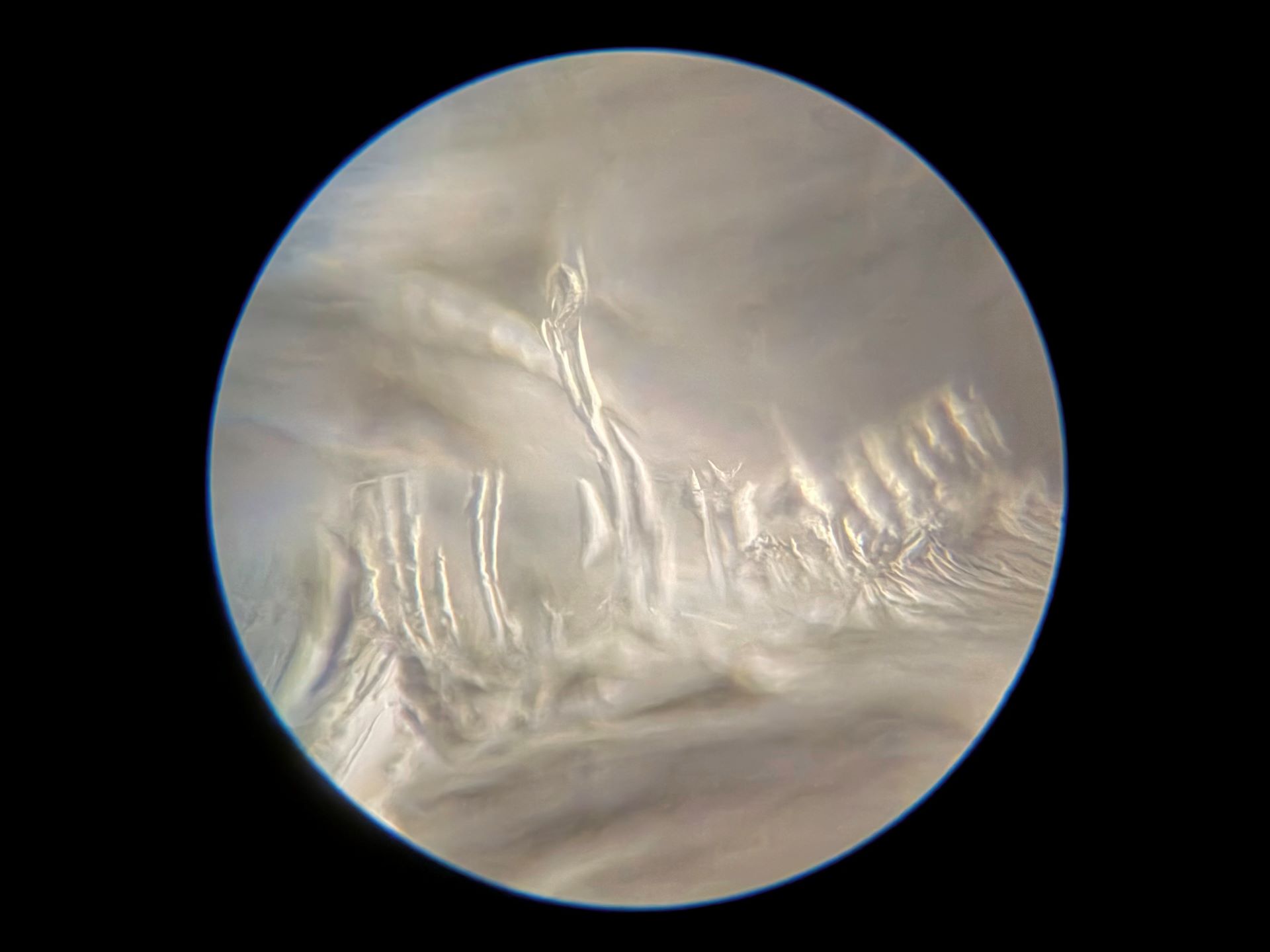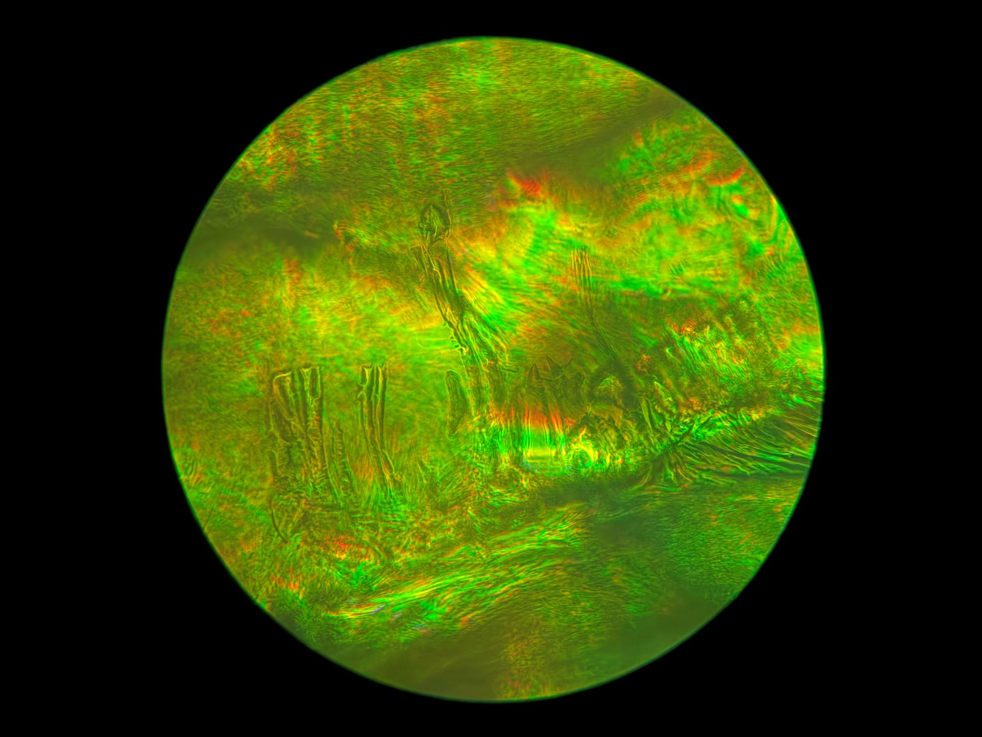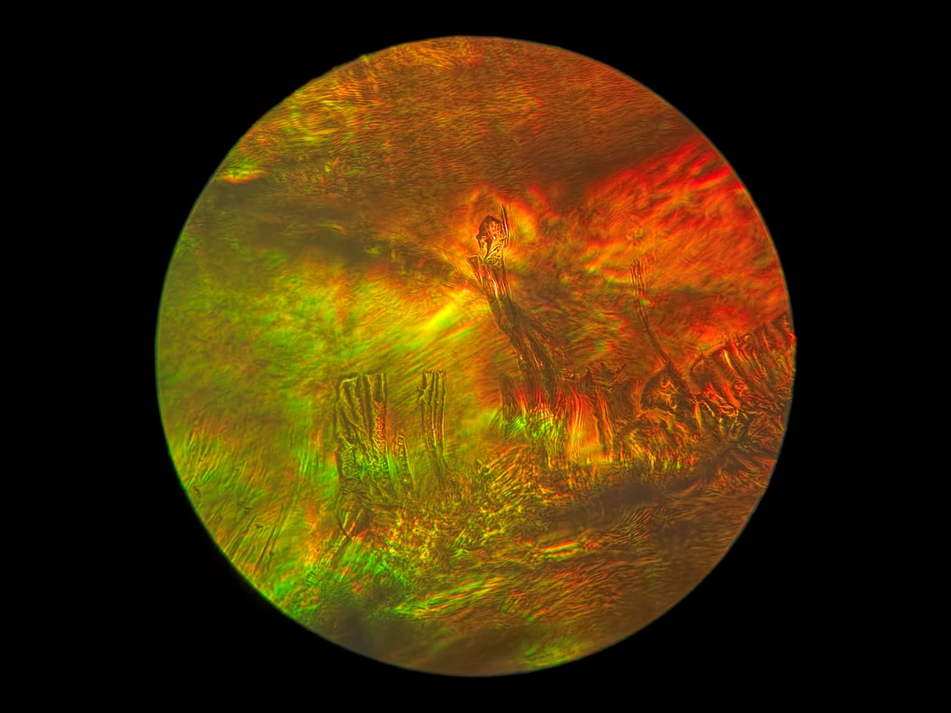 Because of the 40x magnification in this 1/8 inch by 1/8 inch area of broken glass, and how drastically the focus can change with so little adjustment, I may never find this spot on the broken slide again. Even if I can, the light also changes at such a small scale that none of these images will ever be recreated. Instead of mourning that, I'm going to spend more time on this tiny patch of glass to see what else I can find. I have my microscope out of storage now, so there's more coming very soon!