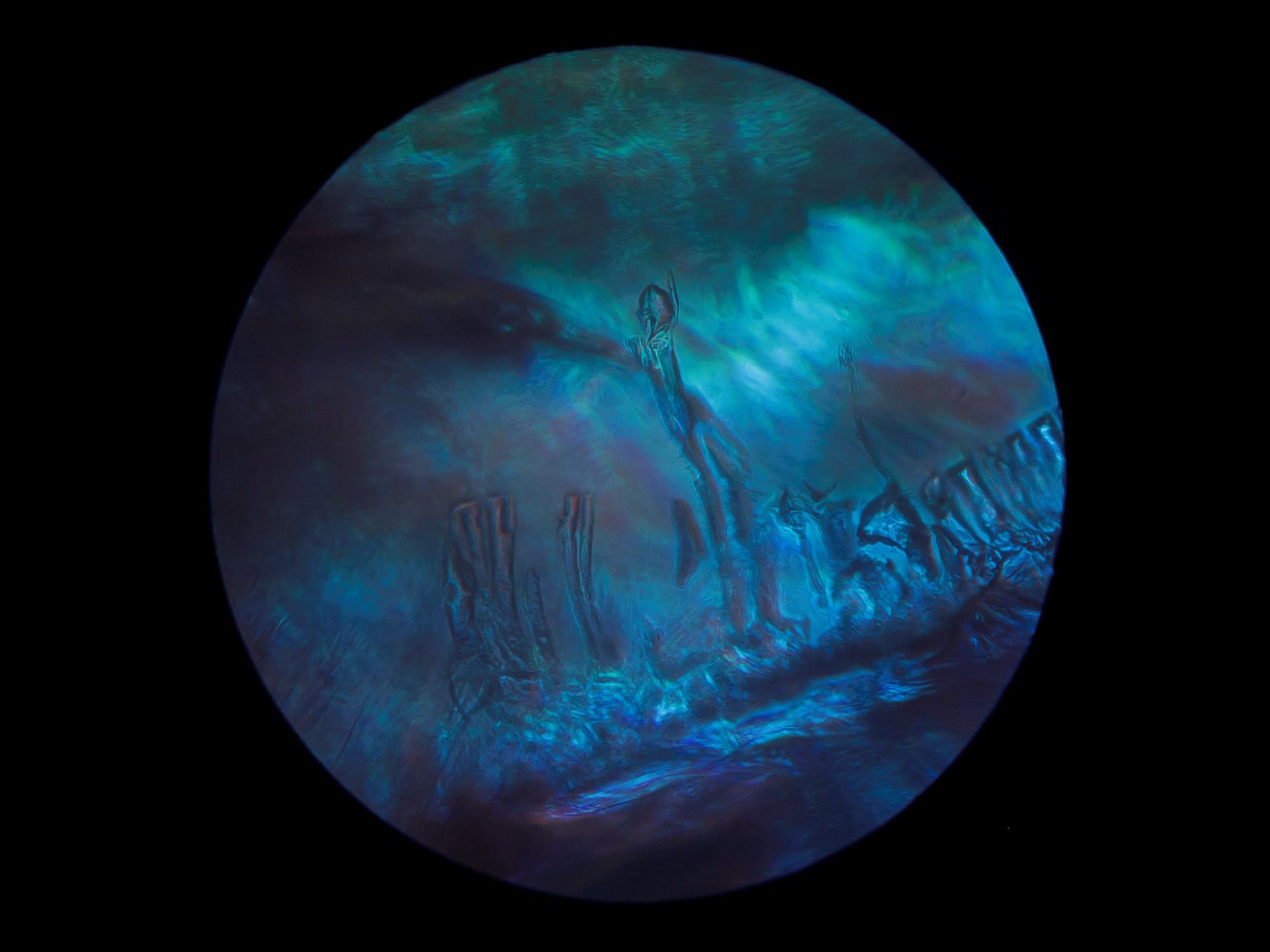 I see a figure standing in a graveyard with their head bowed. The colors in the background, refracted in various ways through the surrounding unfocused glass, give each photo a distinct feeling, though the meaning is up to interpretation. To me, the series depicts a figure experiencing a storm of different emotions represented by the wide range of colors. While most of the photos have intense, abstract swirls of color, some appear to have more literal depictions of storms, especially images 1, 3, and 5 that look to me like lightning, dark rain clouds, and a desert sandstorm scene.